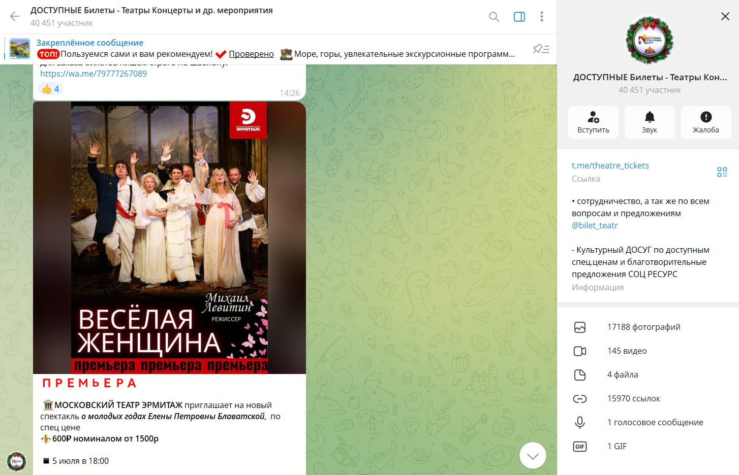 Обзор телеграм-канала theatre tickets: отзывы пользователей и анализ сообщества «Доступные билеты» в Телеграме