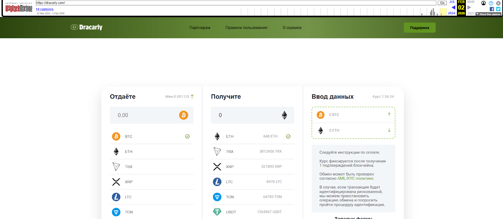 Если судить по архивной версии Dracarly, то для отправки запроса пользователю не нужно было регистрироваться на сайте или раскрывать информацию о себе. Среди доступных направлений были только криптовалюты, так как сервис не позволял выводить средства на карту или в наличные.