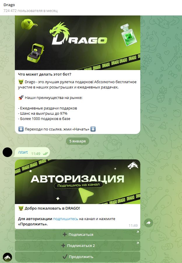 Заявлено, что в боте ежедневно проводят розыгрыши, они происходят в формате рулетки, но не являются бесплатными, как может показаться на первый взгляд. Чтобы запустить приложение, нужно ввести команду /start в основной чат, а потом подписаться на несколько предложенных ресурсов, что уже является подозрительным моментом.