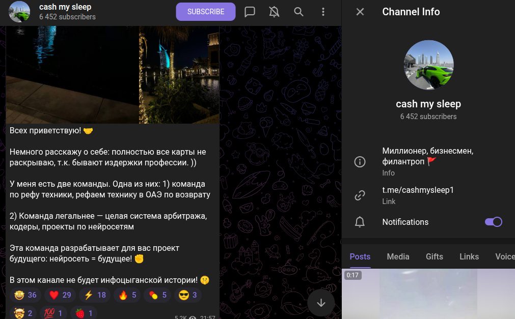 Cash My Sleep — телеграм-канал, на котором эксперт собрал разные варианты сотрудничества. Чаще всего мы видели посты с арбитражем криптовалют и рефаундом техники по ОАЭ. Как видно по направлениям, проект лишь частично легален, поэтому сотрудничество с таким сообществом потенциально опасно из-за будущих проблем с законом.