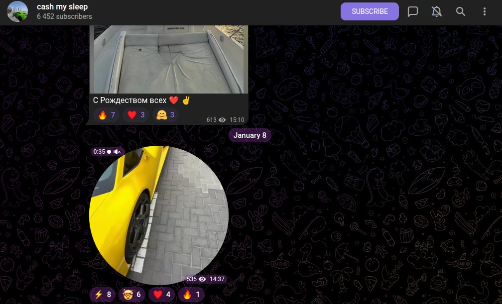 У себя на телеграм-канале cashmysleep1 эксперт по заработку постоянно постит кружочки с большим количеством денег. Кроме этого, на ТГ-канале Cash My Sleep есть публикации, где эксперт садится в дорогой автомобиль.
