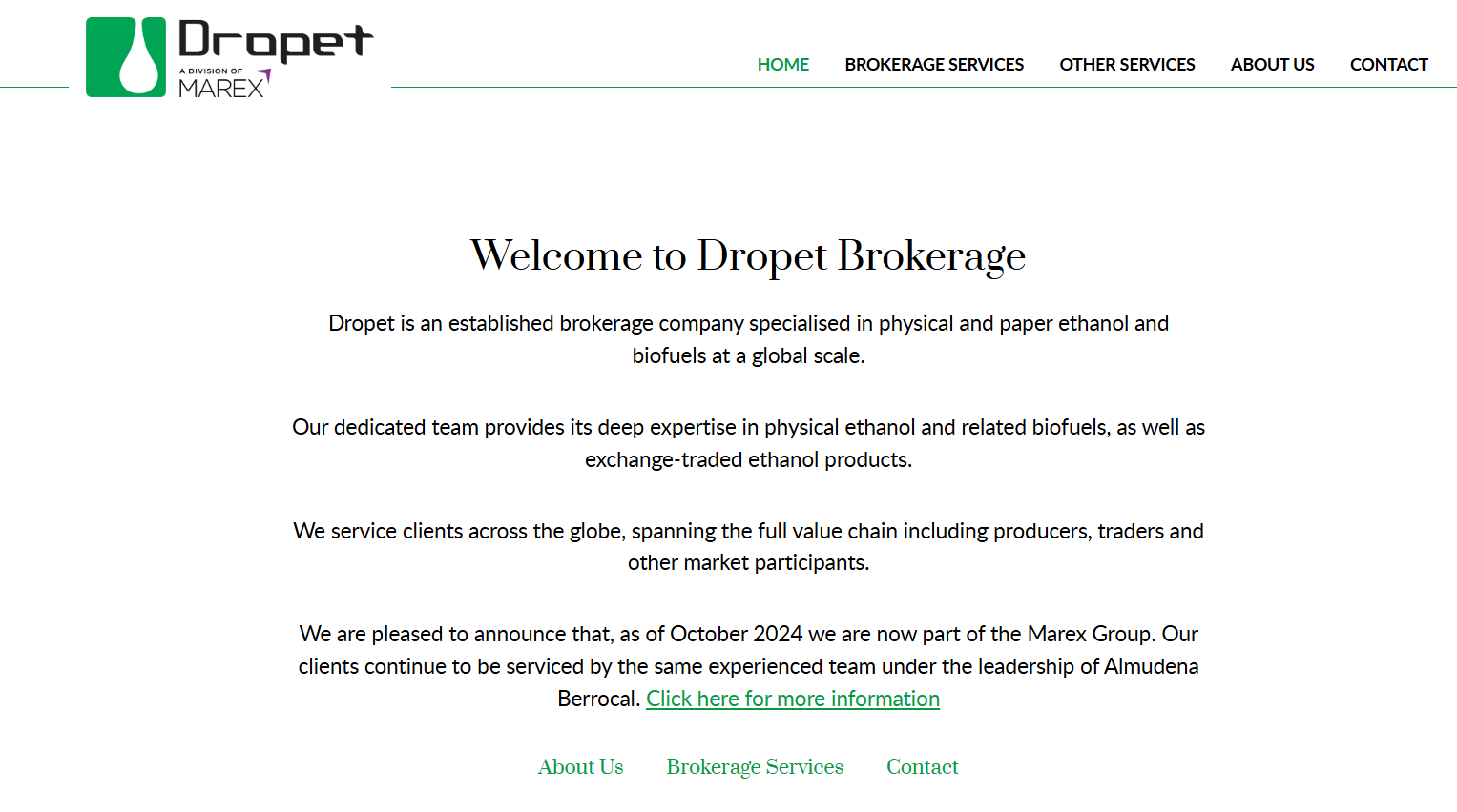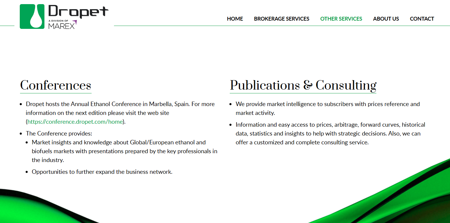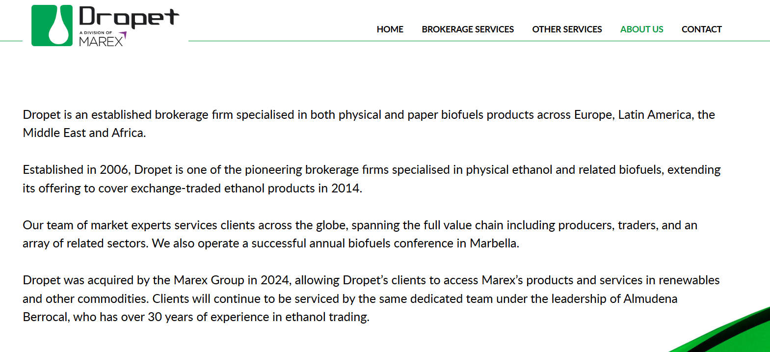 Компания называет себя брокером, который занимается торговлей этанолом и биотопливом — реальными поставками и биржевыми контрактами. Она указывает, что работает с 2006 г. на международном уровне. Среди услуг указаны сделки с этанолом, биодизелем и различным сырьем, а также работа с сопутствующими продуктами.