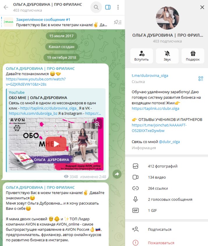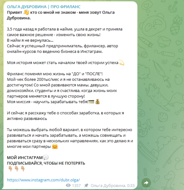 Проект «Ольга Дубровина Фриланс» отзывы в сети не имеет. Это телеграм-канал, в котором автор рассказывает о своей удаленной работе и обучает всех желающих такому виду заработка. В этой сфере девушка около 8 лет, но ни она, ни ее блог успешную репутацию не имеют. Сегодня мы проверим деятельность данной личности и постараемся выяснить, стоит ли с ней сотрудничать или это скам.