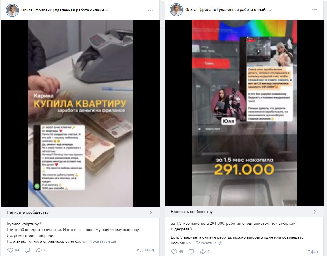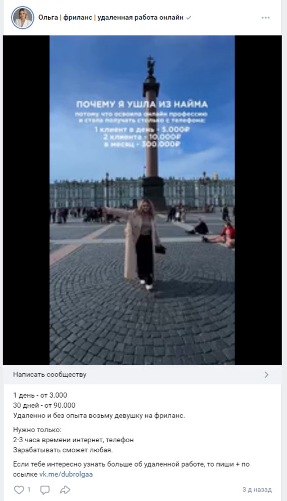 В вк-группе автор уже ищет девушек без опыта, которых она возьмет на ведение. Ольга обещает им ежедневную выплату от 3 000 рублей. Им нужно будет просто уделять работе в телефоне 2-3 часа в день. Это сомнительное объявление, которое не вызывает доверия. Обычно такие уловки в виде легкого и высокого заработка за пару часов в день используют мошенники.