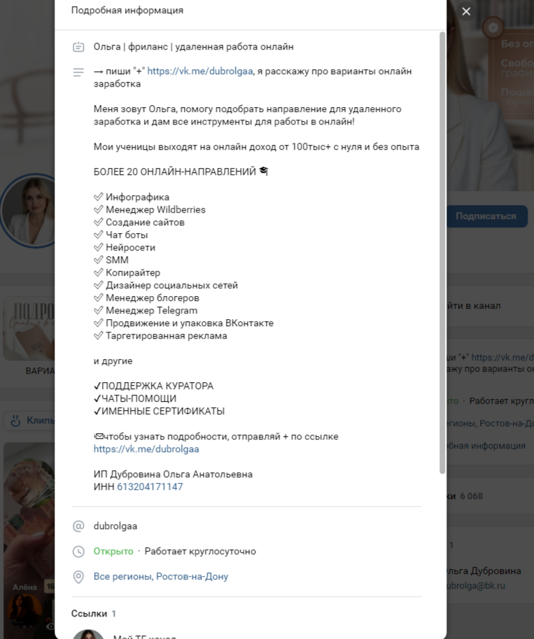Кроме телеграм-канала, Ольга активно ведете группу в Вконтакте «Ольга Дубровина Фриланс», где также рассказывает о своей высокодоходной удаленной работе и выставляет отзывы. Видно, что блогер оформлена как ИП Дубровина Ольга Анатольевна. Статус предпринимателя она получила 29 мая 2017 года, то есть почти 9 лет назад.