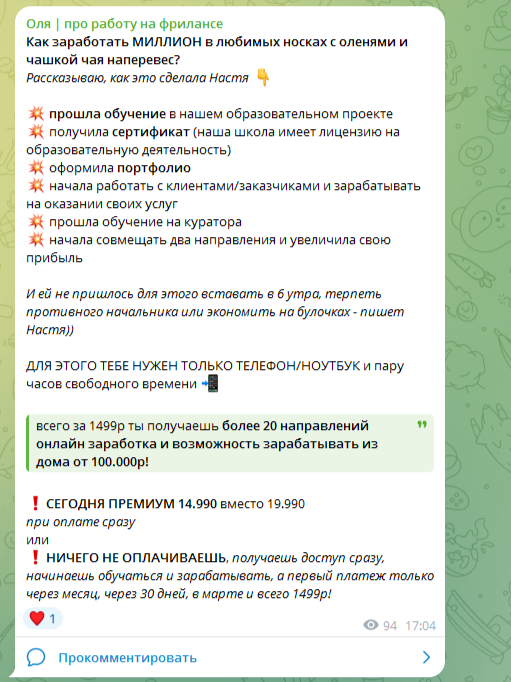 В последней публикации на канале «Оля про работу на фрилансе» она рассказывает, что только сегодня при прямой оплате можно получить премиум-доступ за 14 900 рублей вместо 19 900 рублей.