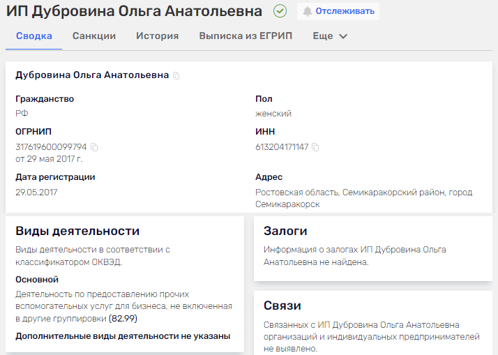 Ее основной вид деятельности связан с предоставлением прочих вспомогательных услуг для бизнеса. Это не совсем соответствует тому, что она транслирует в соцсети. Причем в 2017 году она писала, что занимается проведением онлайн-курсов, но это уже другое ОКВЭД.