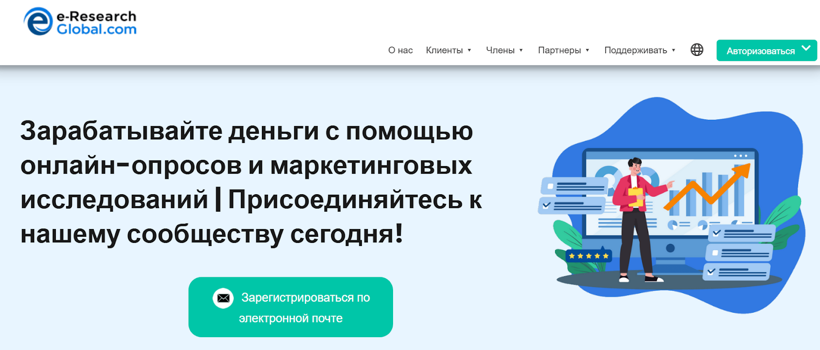 Официальный сайт проекта E Research Global Com – research global com. Это опросник, который позволяет всем желающим зарабатывать на прохождении опросов. Площадка международная, поэтому охватывает большое количество компаний, которым важно мнение людей об их товарах и услугах. Зарабатывать здесь можно с 16 лет с любого устройства.