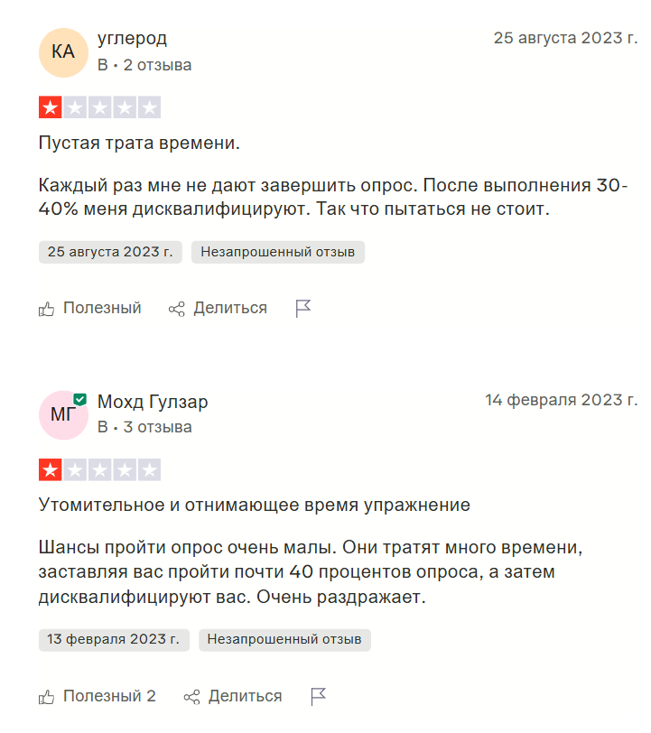Другие пользователи жалуются, что мало шансов пройти опрос, платформа может прекратить исследование в любой момент по причине, что участник не подходит для него, и не выплатить деньги, так как опрос не пройден до конца.