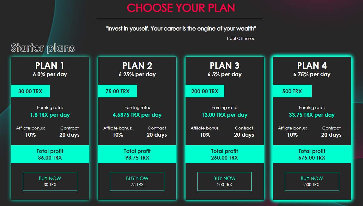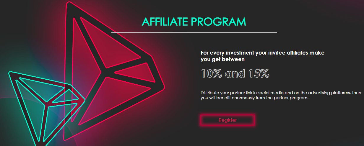 Минимальный депозит составляет 30 TRX, на которые инвесторам обещают прибыль в 6% ежедневно. Максимальную прибыль в 6,75% в день якобы можно получить за 500 TRX, внесенных на счет. Также есть партнерская программа с выплатами до 15% с депозита реферала.