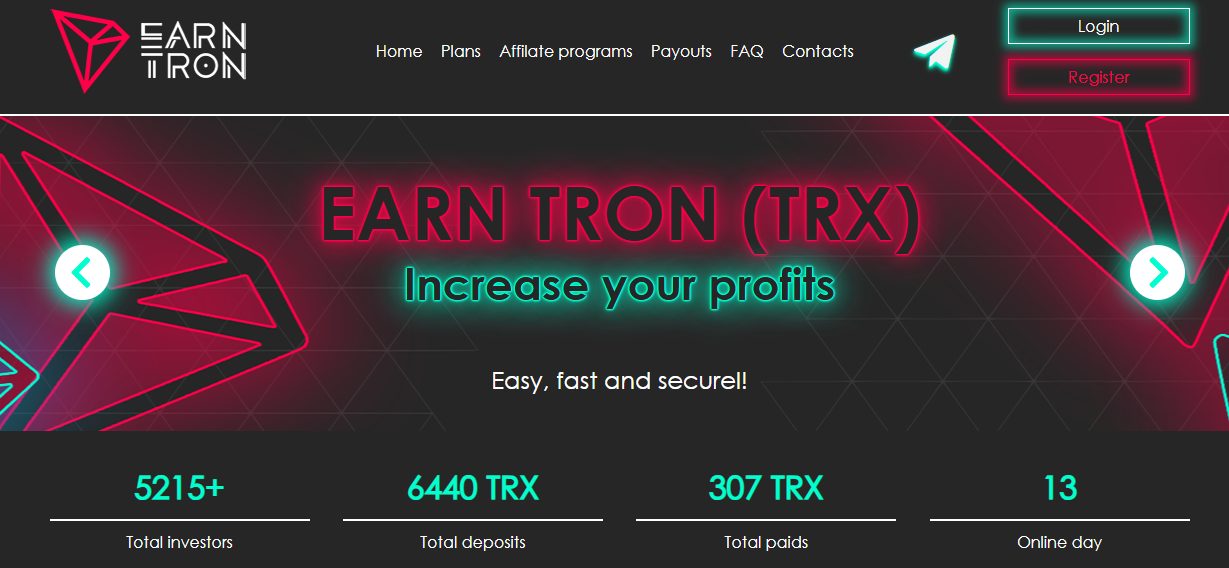 EARN TRON — обычная финансовая пирамида, которая обещает огромную прибыль без усилий. Ее команда может некоторое время выплачивать заработки одним пользователям из депозитов других, но в итоге такая схема всегда разваливается.