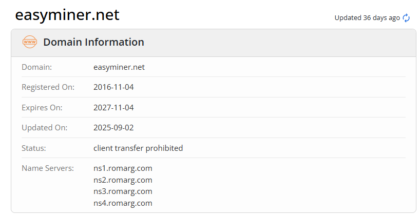 Сайт easyminer net работает достаточно давно. Домен зарегистрировали еще в 2016 году.