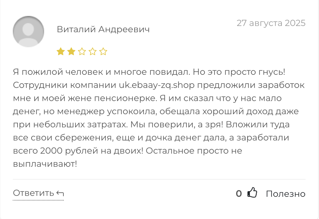 Независимых отзывов о платформе Ebaay Cq Shop очень мало в сети. При этом все, что есть на форумах — сплошной негатив. Люди массово описывают финансовые потери благодаря проекту. Пользователи предупреждают, что команда завлекает красивыми обещаниями от менеджеров, а затем просто блокирует и не дает выводить деньги.