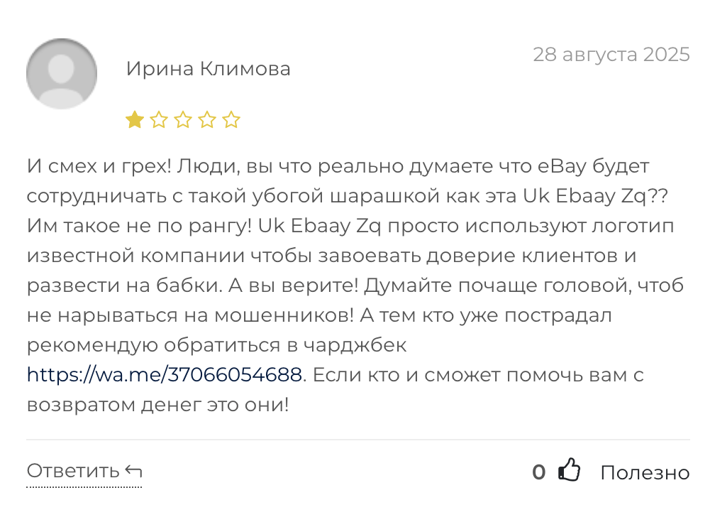 Название Ebaay Cq является очевидной отсылкой к eBay, известной торговой площадке. Это может быть сделано намеренно, чтобы залечь пользователей, создавая иллюзию связи с крупной, легитимной компанией. Но официальных подтверждений сотрудничества нет.
