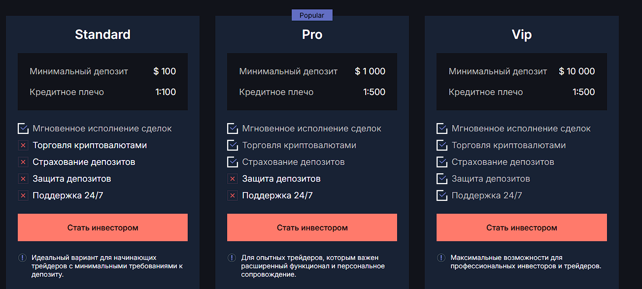 Ecolucre предлагает три типа торговых счетов: «Standard», «Pro» и «VIP». Минимальный депозит – $100, $1000 и $10000 соответственно. Кредитное плечо – 1:100-1:500.