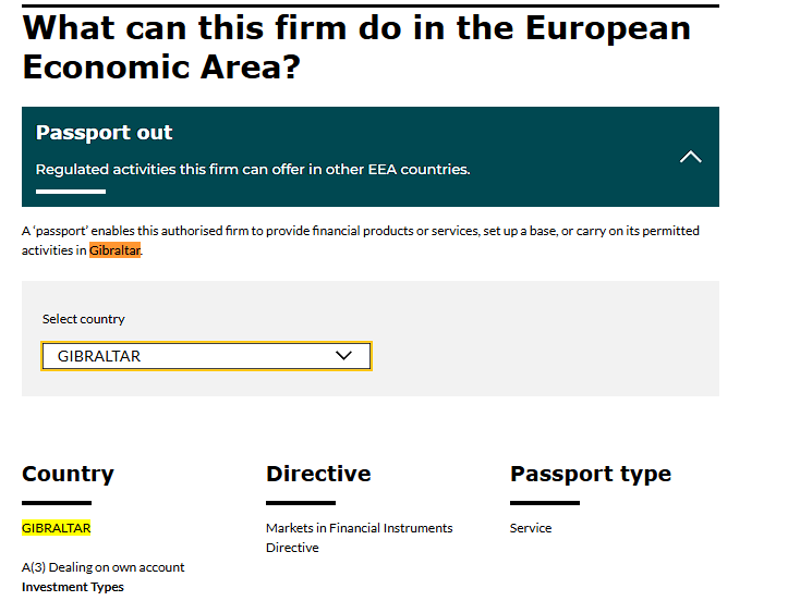 Фрагмент записи из реестра FCA. На скриншоте значится, что компания работает по паспорту Гибралтара.
