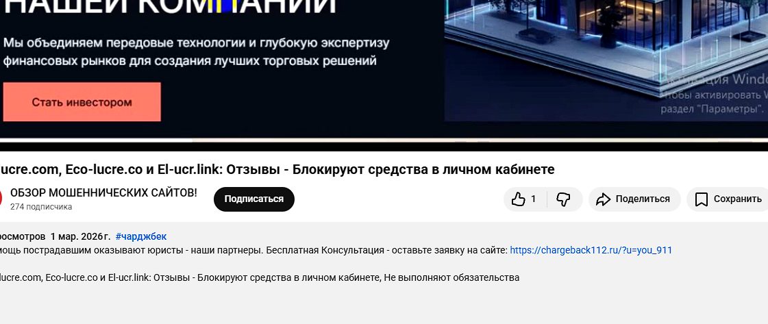 Один из обзоров брокера и его дополнительных страниц на YouTube. Его автор также приходит к выводу, что Ecolucre – это скам.