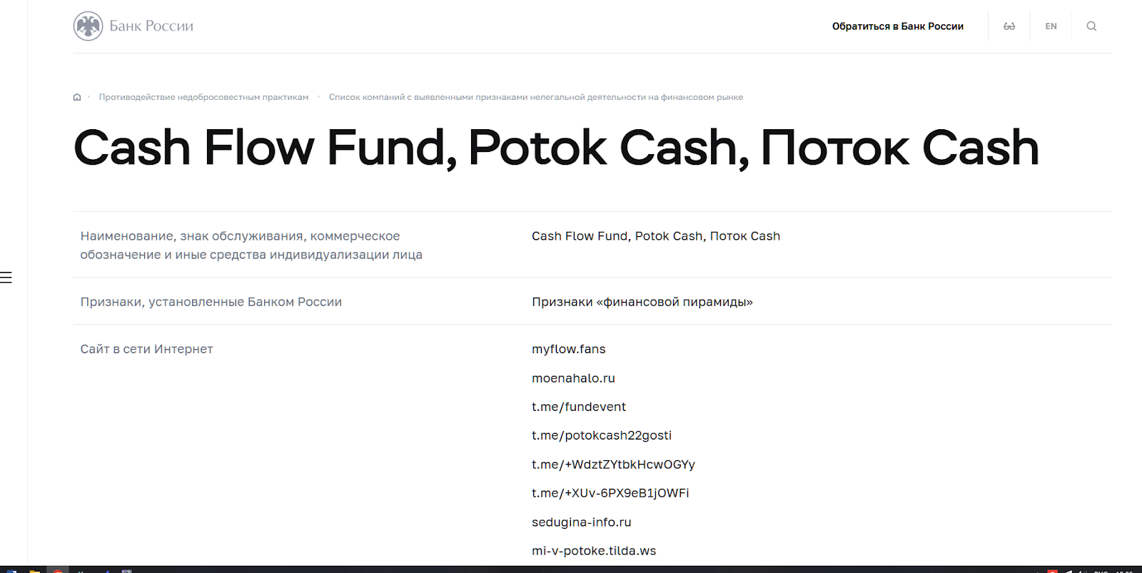 ЦБ РФ классифицировал компании Cash Flow Fund, Potok Cash, Поток Cash как финансовые пирамиды. Но надо быть внимательнее, так как мошенники регулярно регистрируют новые мошеннические сайты и продолжают рассказывать сказки про быстрое и надежное обогащение.