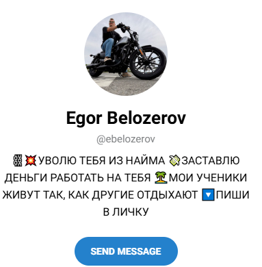 В описании своего телеграм-аккаунта Егор Белозёров заявляет, что он способен обеспечить всем желающим «красивую жизнь» и избавить их от необходимости работать. Чтобы узнать дополнительную информацию об этом, пользователь должен написать ему в личные сообщения. Давайте выясним, правда ли этот «эксперт» может указать путь к богатству, или он просто обманывает доверчивых людей.