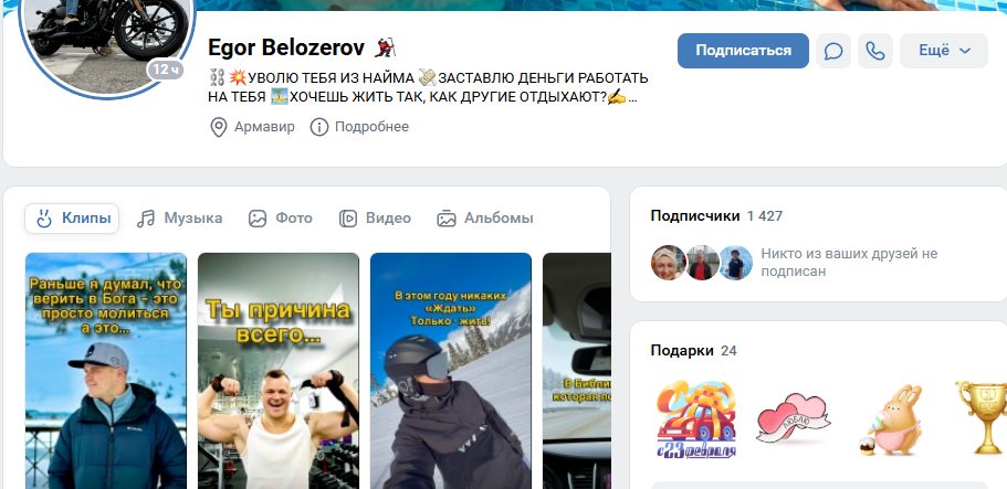 Посты, которые выкладывает автор на своей странице ВК, носят мотивационно-философский характер и содержат мало практического смысла. В одном из них автор сообщает, что в 2026 году следует «не ждать, а жить». Примечательно, что публикация собрала всего 12 реакций. Очевидно, это и есть истинный уровень популярности Белозерова: он практически никому не интересен.
