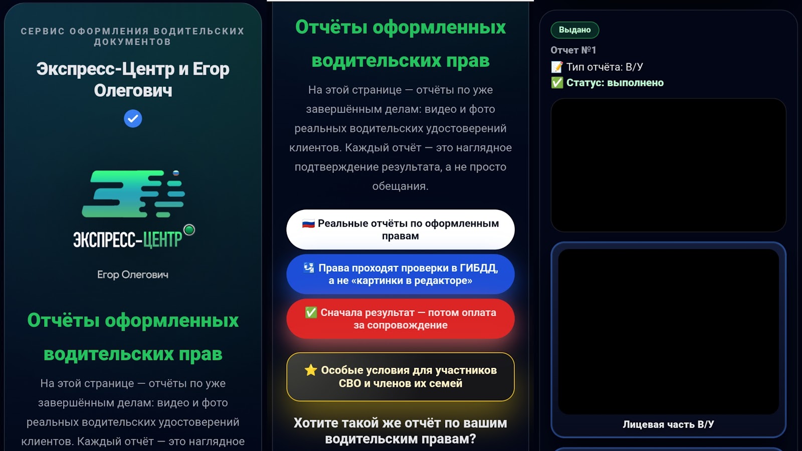 Егор Олегович оставлял ссылки на платформу express center proof, где демонстрировал отчеты по работы. В них обозначен тип работы и статус. Проект занимается: оформлением водительских удостоверений, заявлений, выдачей справок и другими направлениями. Как сообщает Egor Olegov1ch, услуги объединяют заказчика и исполнителя. Как написано на веб-ресурсе, права проходят проверки ГИБДД. Также клиентам обещают безопасность и выгодный доступ к документации.