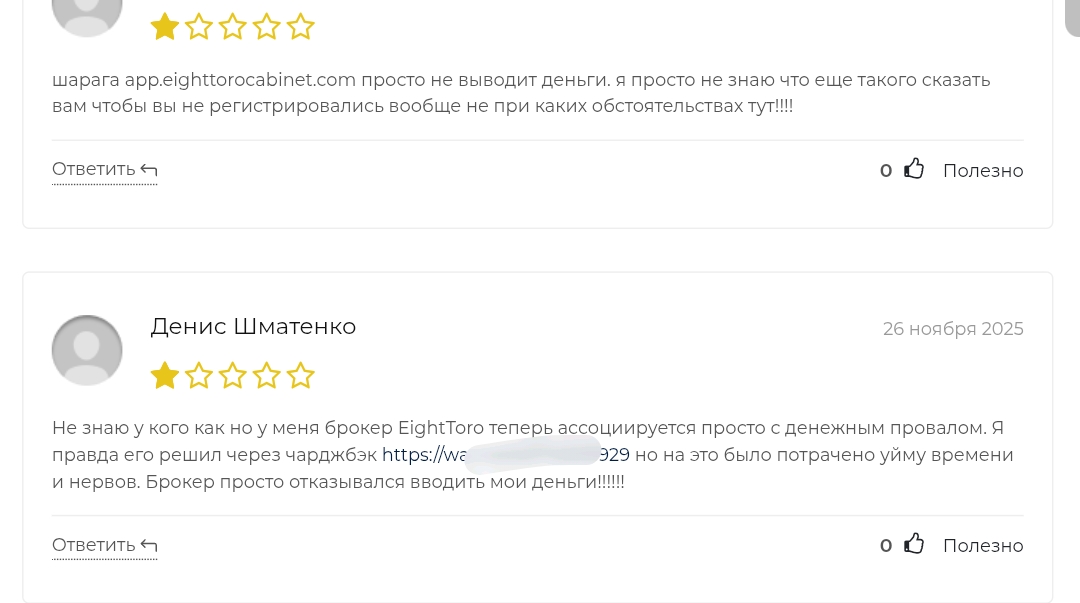 Отзывы о брокере Eight Toro com в основном отрицательные. На тематических форумах пользователи жалуются, что брокер задерживает вывод средств неделями. Описываются случаи, когда после внесения повторного платежа вывод так и не открывается, а счет навсегда уходит в статус «проверки безопасности».