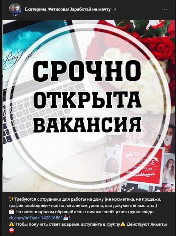 В группе Екатерина предлагает возможность удаленного заработка, но ничего не сообщает о самой вакансии, кроме возможности «оставаться с семьей».