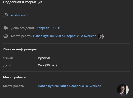 Изучив личную страницу Екатерины Фетисовой, мы увидели варианты инвестиций – речь идет о том, что в качестве места работы у этого человека указана группа некоего Павла Кульчицкого.