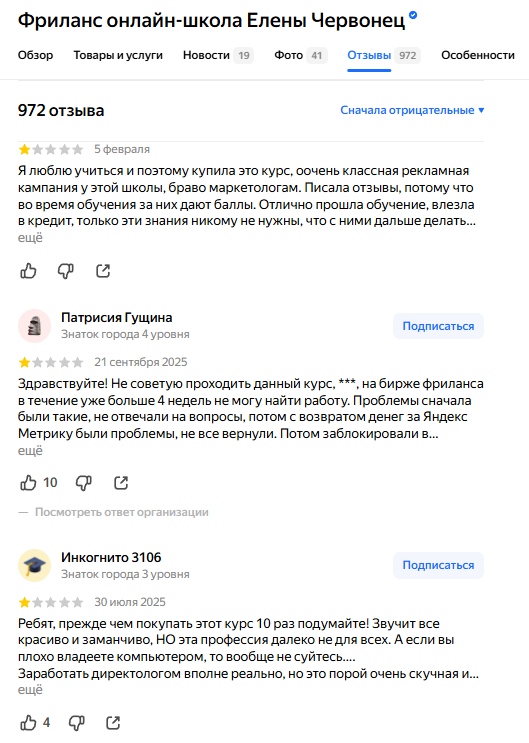 Мы провели обзор деятельности специалиста и выяснили, что у проекта многолетняя история, есть государственная лицензия на образование, подтвержденный статус ИП, публичные кейсы по рекламе и упоминания в СМИ, но не все отзывы о курсах по обучению от Елены Червонец могут оказаться реальными. По итогу: