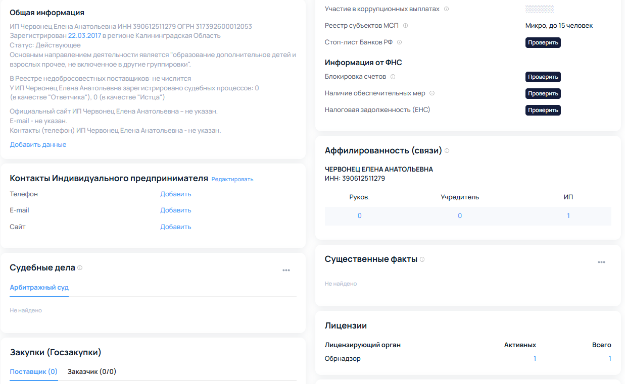 На своих сайтах Елена показывает кейсы, которые позволили увеличить конверсию и снизить среднюю цену за клик, что можно отнести к формальному подтверждению опыта. Девушка также предоставляет сертификаты и указывает юридические данные, а проверка показала, что основатель школы по удаленке Елена Червонец не только зарегистрирована как предприниматель, но и имеет лицензию на образование.
