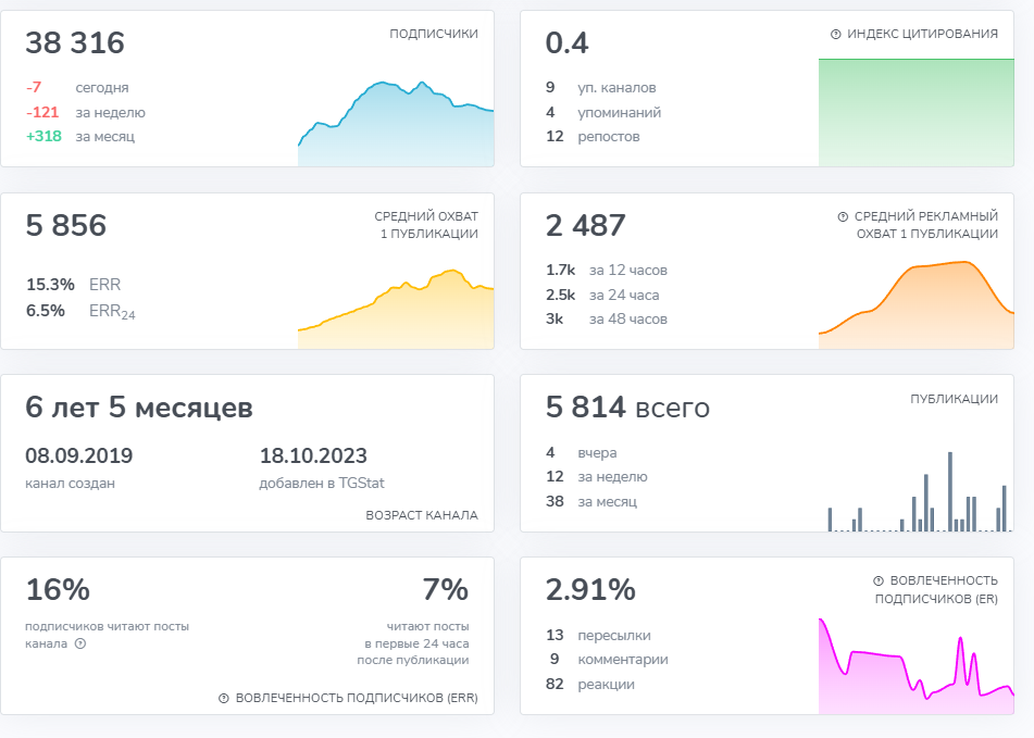 Канал в Телеграмм запущен в 2019 году, на него подписалось 38 000 пользователей, но индекс цитирования менее единицы, вовлеченность доходит до 3%, а посты просматривают 17% участников.