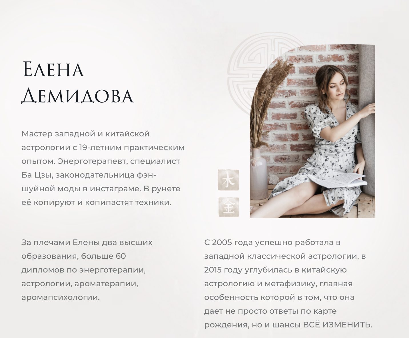 Если верить информации на лендинге Asteraia Info, Демидова Елена — это экстра-специалист в сфере, существование которой не признает большинство ученых. Она пишет, что получила 60 дипломов по фэн-шуй, но не называет учебного заведения, которое закончила. Тем не менее, девушка считает себя мастером западной и китайской астрологии с опытом работы в 20 лет. Может читать схемы Ба Цзи и исцелять энергии.