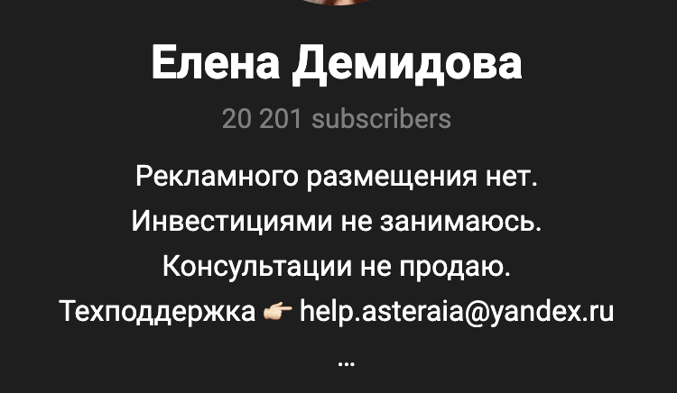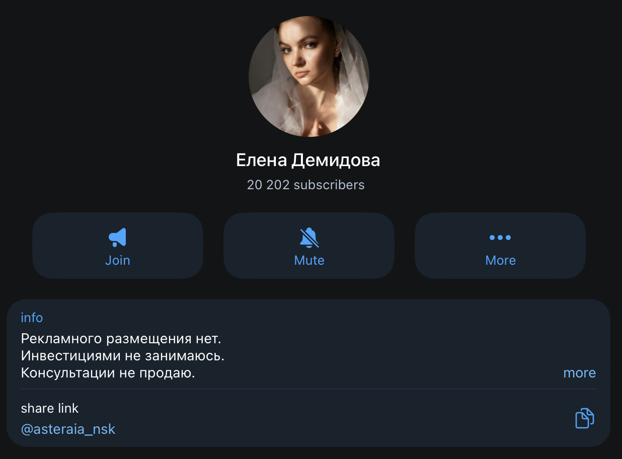 Паблик в мессенджере собрал 20 тыс. подписчиков. Именно в нем Демидова дистанцируется от однофамилицы по имени Алёна и говорит о том, что никакими инвестициями не занимается и рекламу не продает.