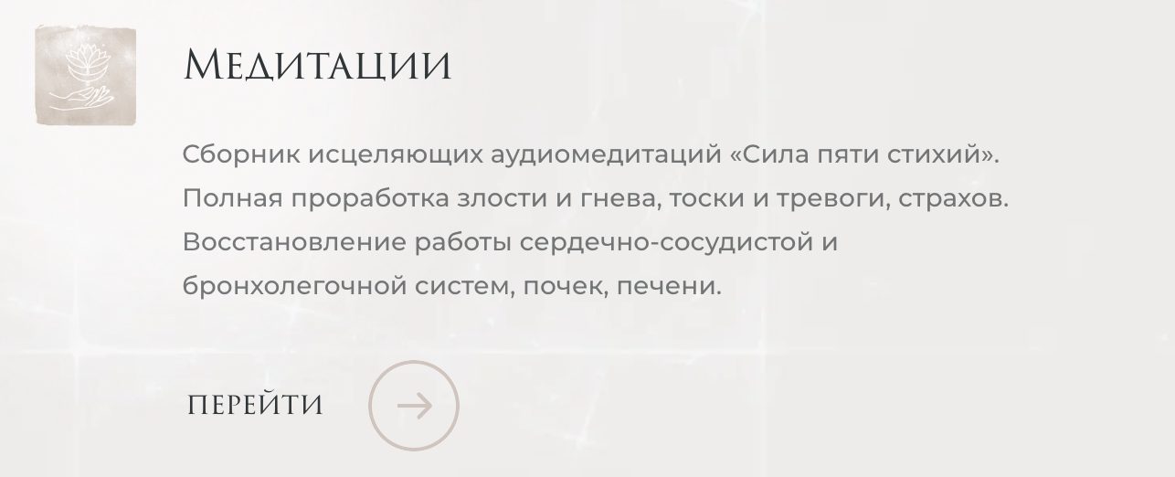 В этом разделе доступны аудиофайлы, с помощью которых можно медитировать и прорабатывать злость, гнев, страхи, тоску и тревогу. При их использовании, если верить Демидовой, можно улучшить работу дыхательной системы, исцелить почки и печень, восстановить сердечно-сосудистую систему.