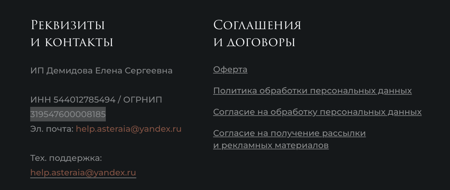 Несмотря на отсылки к метафизике, на самом деле Елена пытается соблюдать действующее законодательство. Она оформила статус предпринимателя и работает как ИП Демидова Елена Сергеевна с ИНН 544012785494 и ОГРНИП 319547600008185. На сайте есть все необходимые реквизиты и даже документы, которые требуются по закону.