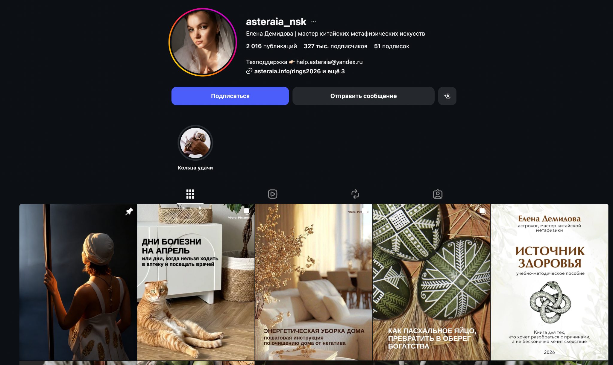 В этой социальной сети доступен паблик asteraia_nsk под названием «Елена Демидова | мастер китайских метафизических искусств». Девушка активно ведет ленту и уже выложила более 2 тыс. публикаций. Они привлекли 327+ тыс. подписчиков.