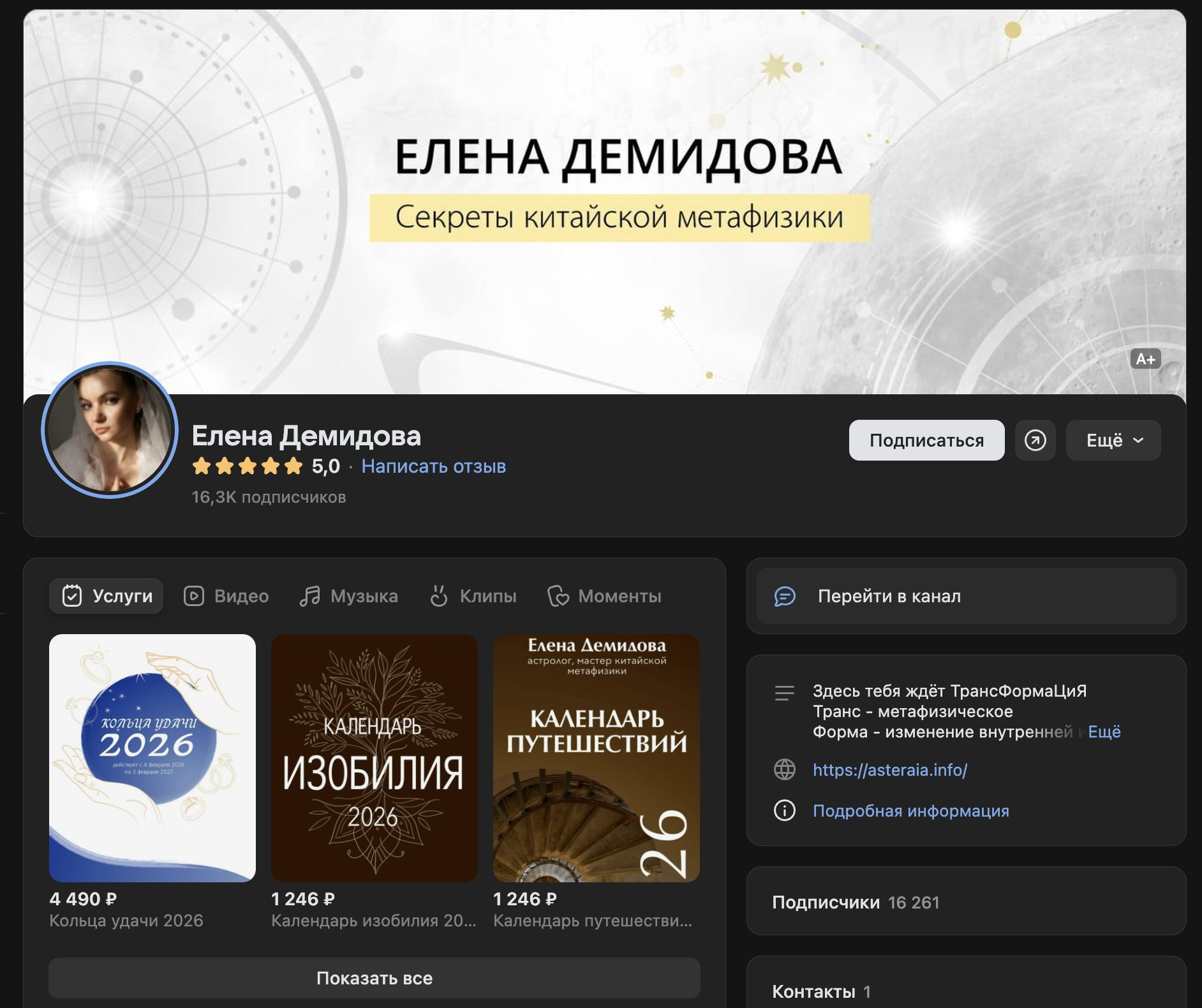Посты в ленте тоже касаются только эзотерической деятельности админа. Она пишет длинные посты и короткие публикации, посвященные философии, фэн-шую и т.п. Попутно продвигает свои инфопродукты. Например, учебно-методическое пособие с календарем болезней на 2026 год.