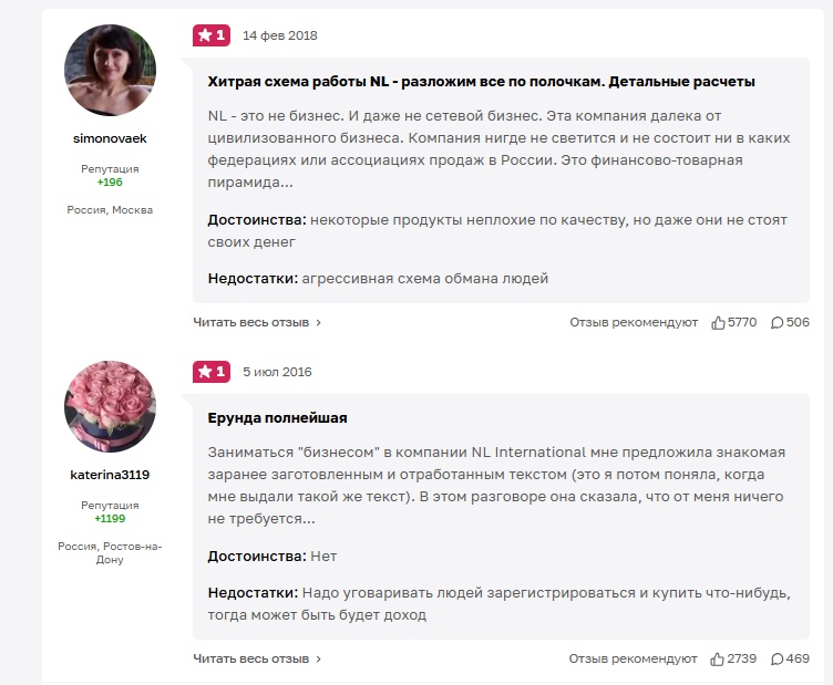 Один из самых популярных отзывов оставил пользователь simonovaek в 2018 году. Он подробно разобрал схему NL и заявил, что бизнесом это назвать нельзя. По его словам, компания не состоит в ассоциациях, не светится на рынке и использует агрессивные схемы обмана. Продукты там неплохие, но своих денег не стоят. Отзыв поддержали почти шесть тысяч человек.
