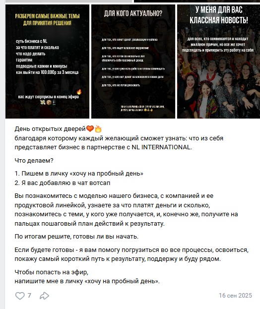 Елена регулярно проводит так называемые дни открытых дверей. Это онлайн-встречи для тех, кто хочет понять, как устроен бизнес в партнерстве с NL International. Она приглашает всех, кто ищет перемены, новый источник дохода или мечтает зарабатывать от трехсот тысяч рублей. Никакой регистрации не требуется, сначала предлагают посмотреть, а потом уже принимать решение.