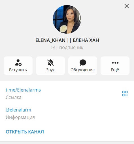 Основная площадка Елены — Telegram-канал с названием ELENA_KHAN || ЕЛЕНА ХАН @elena elenalarm. Ссылка на него ведет на username @elenalarm. Оформление канала стандартное, без излишеств. В шапке профиля указано, что автор объединяет женщин и учит зарабатывать онлайн. Тематика постов смешанная — мотивация, личные фотографии, упоминания о финансах и регулярные отсылки к NL International.