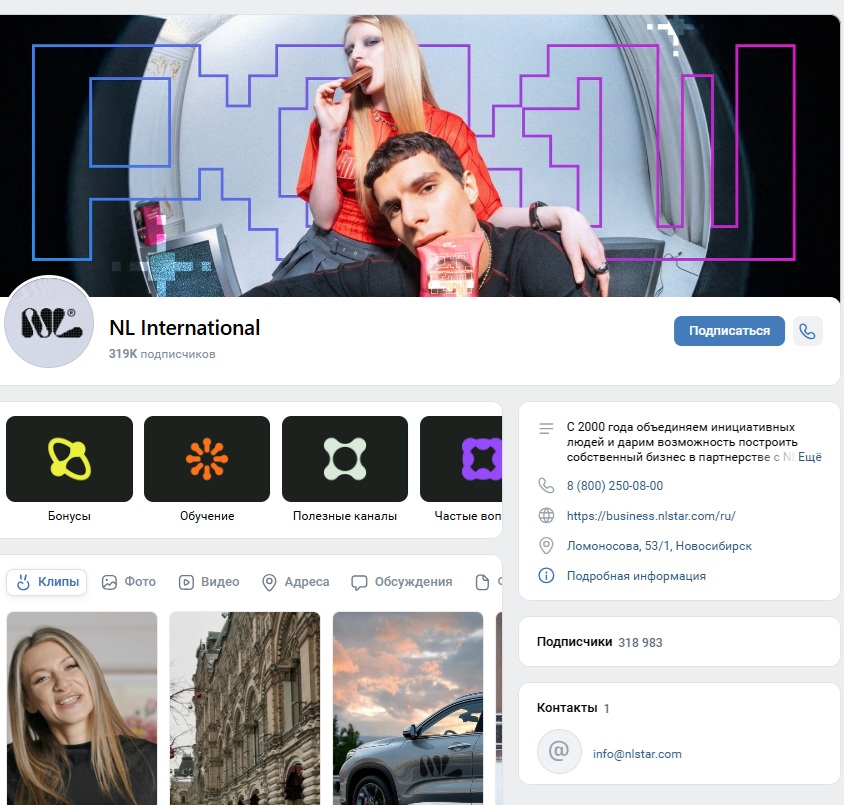 Страница ВКонтакте у Елены тоже есть. На аватарке она сама, в описании указано место жительства Москва и ссылка на NL International. В клипах у нее несколько десятков роликов, набрали они немного просмотров — от 50 до 79. Подписки у Елены в основном на женские клубы, форумы и соседские сообщества вроде Павшинской поймы. Это говорит о том, что аудиторию она привлекает из простых бытовых групп, а не из профессиональных трейдерских сообществ.
