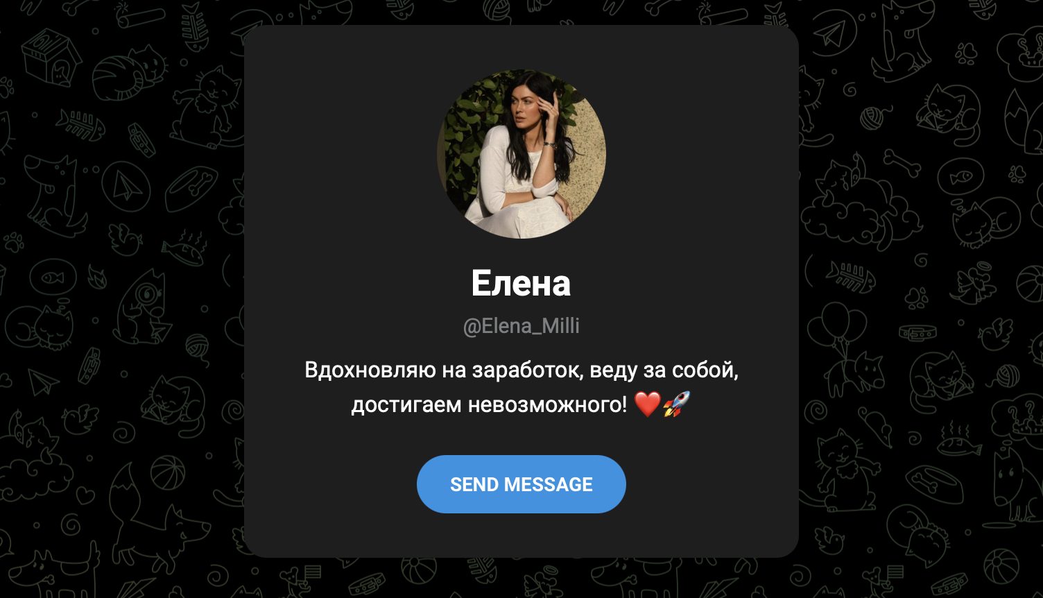 Личный аккаунт автора проекта Elena Milli указан как поддержка и администратор. Это главная точка входа: именно сюда предлагается подавать заявки и запрашивать данные для перевода средств. За пределы мессенджера проекта Елены не выходит, что характерно для анонимных и сомнительных скам-сообществ.
