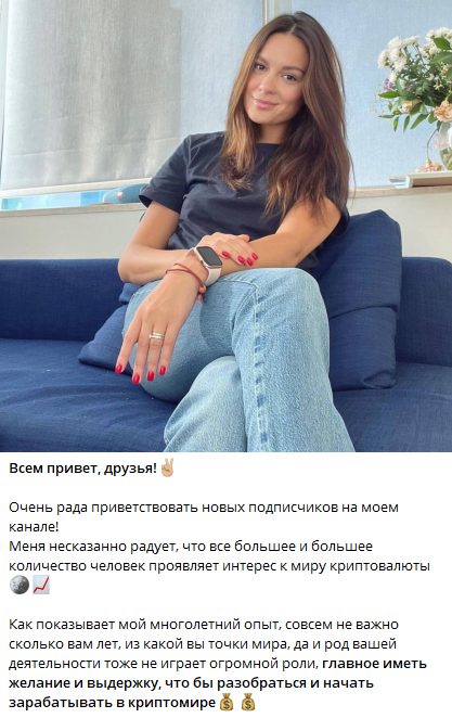 Прикрываясь фотографиями очередной куклы-актрисы, записавшей с десяток роликов под заказ, трейдер Елена Шевцова зазывает клиентов на высокодоходные инвестиции. Причем, по заявлениям наставницы, от клиента не требуется ни знаний в сфере криптовалют, ни других навыков. Нужно только найти 500–1000 рублей для старта, а всю работу псевдоаналитик обещает взять на себя.