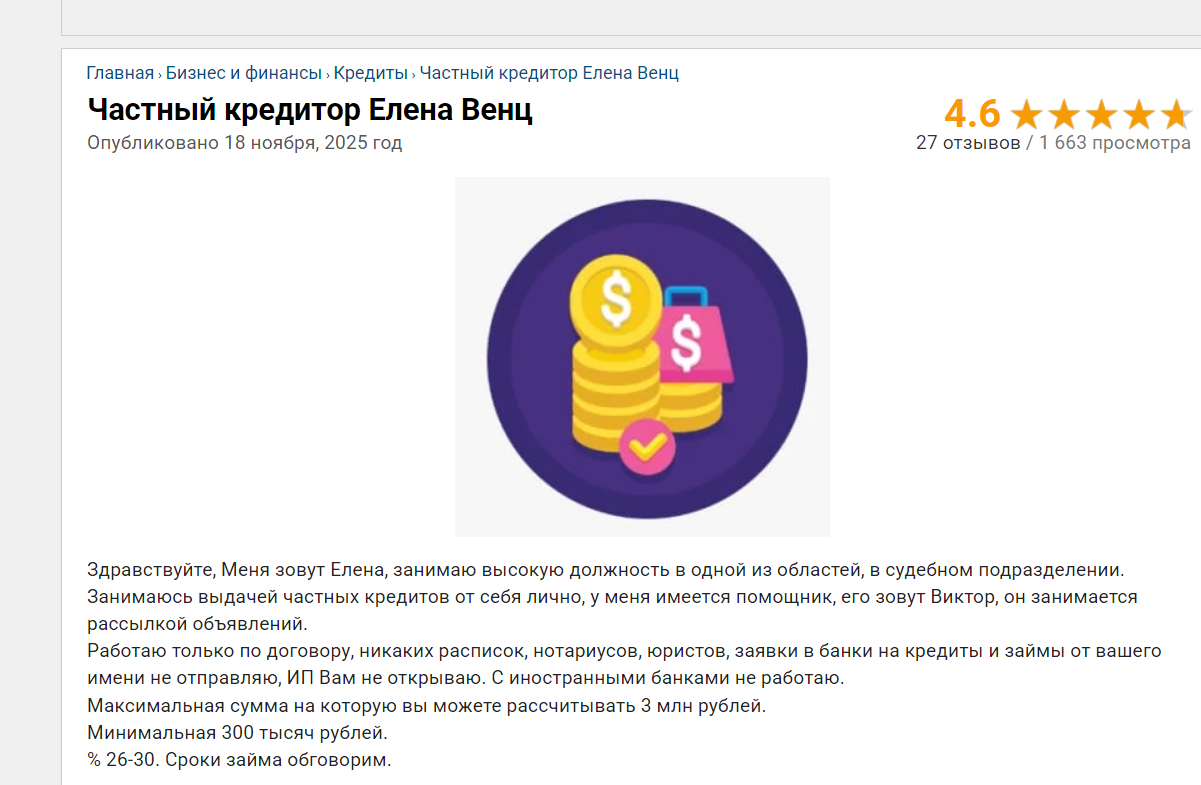 На сайте есть отзывы о том, что частный кредитор, работающий через Телеграмм аккаунт Elena Wenz, занимается мошенничеством.