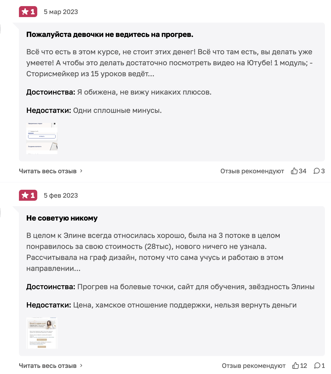 Отзывы о курсах Элина Жгенти получила довольно негативные. Пользователи дают довольно жесткую оценку обучению: курс не оправдывает свою стоимость и не дает новой информации. Также встречаются претензии к формату подачи и содержанию модулей в отзывах о школе Элины Жгенти.