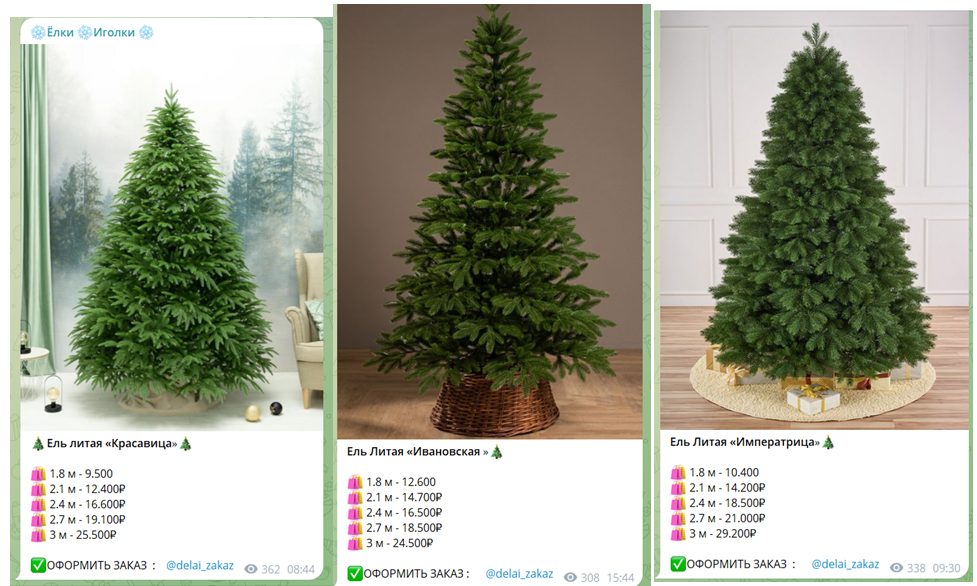 “Елки Иголки” — телеграмм канал, который занимается продажей литых искусственных елок с доставкой по России и рекламой в других тг-сообществах, особенно в предновогодний период.