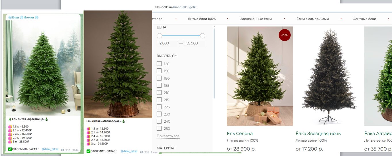 Если сравнить цены в тг канале с официальным магазином, разница выглядит слишком заметной. В тг литые елки высотой 1,8–2,1 м продают за 9–12 тысяч рублей, тогда как в официальном магазине с тем же брендом, ООО, офертой, гарантиями и контактами такие модели стартуют от 13 до 17К рублей и доходят до 30–50К за более плотные и премиальные варианты.