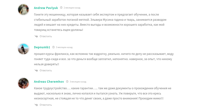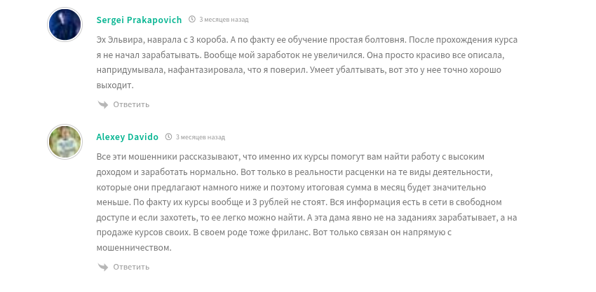 Отзывы про @elvirabylove в интернете исключительно негативные. На независимых форумах и сайтах-отзовиках пользователи массово жалуются на низкое качество обучения и хамское отношение после оплаты.