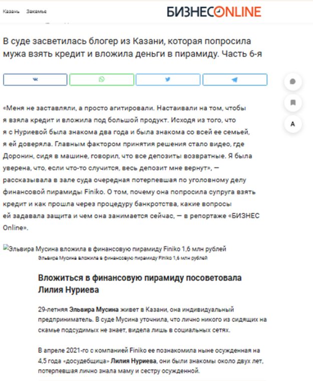 Если же отбросить эмоциональную шелуху и проверить факты, биография наставницы обрастает весьма неприятными подробностями. В сети можно найти информацию о том, что ранее Эльвира настойчиво зазывала людей в печально известную финансовую пирамиду Finiko. Она агитировала брать кредиты и нести деньги в скам-проект, который в итоге оставил без гроша тысячи вкладчиков. После краха пирамиды «лидер мнений» не понесла ответственности, а просто перепрофилировалась в коуча по заработку. Более того, в открытых источниках есть данные о ее банкротстве.
