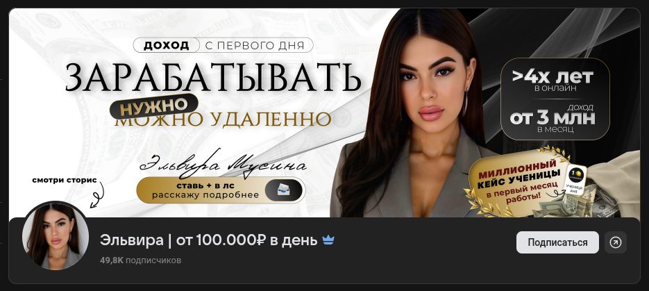 Как показали отзывы, «Эльвира | заработок от 100 тысяч в день» – очень подозрительный и, скорее всего, скамный проект. Создательница паблика сулит подписчикам жизнь мечты, переезд на Бали и ежемесячный доход в 3 миллиона рублей, при этом уверяет, что для старта достаточно телефона и пары часов свободного времени.